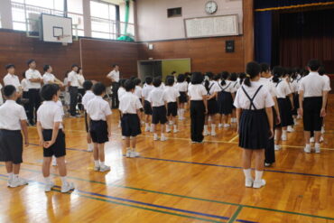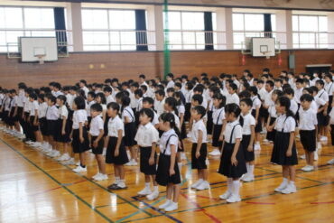 全校児童生徒がそろって始業式を行いました。暑い中でしたが、どの学年もしっかり話を聞くことができました。