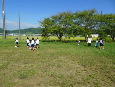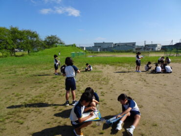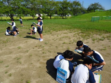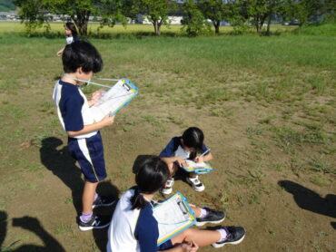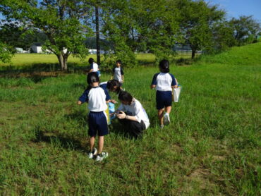 3年生は、理科の授業で昆虫の体のつくりを調べるために、観察する昆虫を探しに築山に来ました。