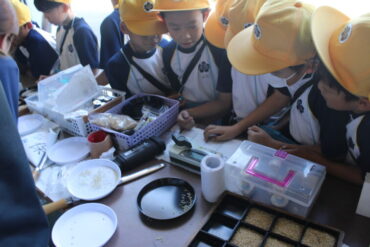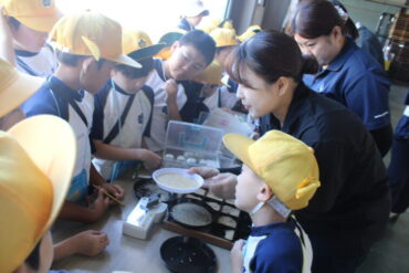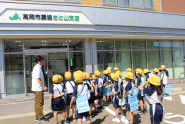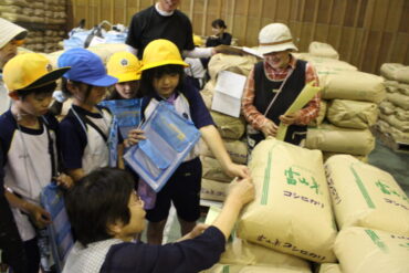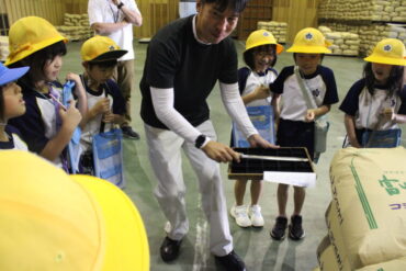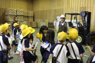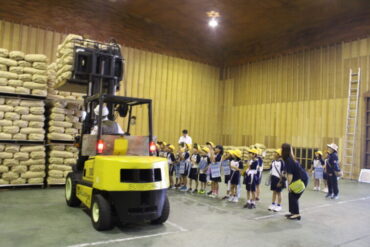 町探検パートⅡで、「JAさと山支店」の見学に行きました。特に、お米の検査について詳しく説明をしてくださいました。そして、検査のために穴を開けたお米袋に、検査済みのシールを貼ったり、お米の水分チェックを体験したりすることもできました。さらに、30㎏のお米袋を42袋まとめて、フォークリフトで高く積み上げる様子も見せてくださいました。