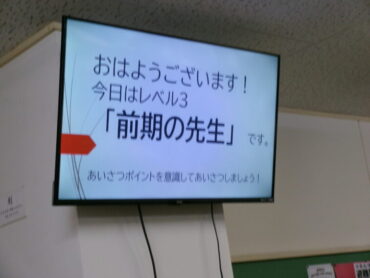 2025.10.1 1学年 2学年 3学年 4学年 5学年 6学年 「あいさつタワー」3日目 「あいさつタワー」の取組は3日目。今日のレベルは前期課程の先生にあいさつすることでした。モニターにも表示されました。タワーは昨日までたくさんになったので、今日はリセットしてまた積み上げることになったようです。