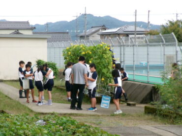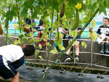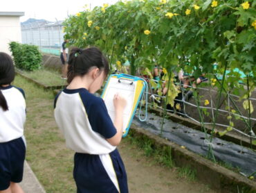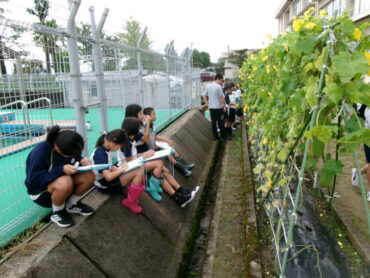 4年生の理科は、育てているへちまの観察です。これまでとの違いを確認していました。