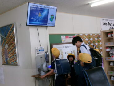 児童生徒玄関のモニターに、学習発表会のスローガンが映し出されました。