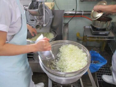 ①機械で玉ねぎを裁断します。玉ねぎが細かくなるように、機械に2回かけます。