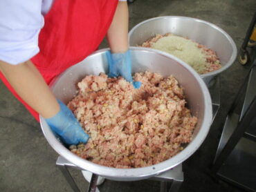 ②玉ねぎ、おから、大豆、豚挽き肉、パン粉、水、塩、こしょうをこねます。学校給食は量が多いので、2つのタライに分けて、きれいに混ざるようにしています。