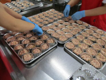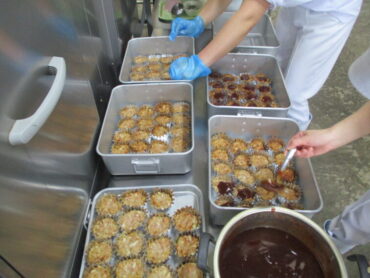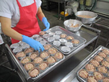 ③丸く成形し、全校児童・生徒分約230個並べたアルミカップの中に入れていきます。前期・後期で大きさが少し異なります。数が多く、時間のかかる作業です。
