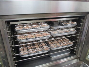 ④アルミカップを並べたトレイに水を張り、前期児童分は180度のオーブンで20分、その後追加で200度10分蒸し焼きしました。後期生徒分は前期分に比べて少し大きいので、200度で30分蒸し焼きしました。