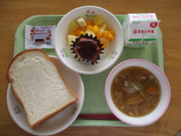 ⑥昨日の給食は、食パン、変わりミートローフ、フルーツあえ、キャベツのもちもちスープでした。変わりミートローフはそのまま食べてももちろん美味しいですが、食パンに挟んで食べている子供たちも見受けられました。