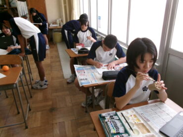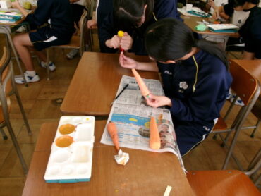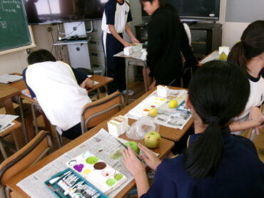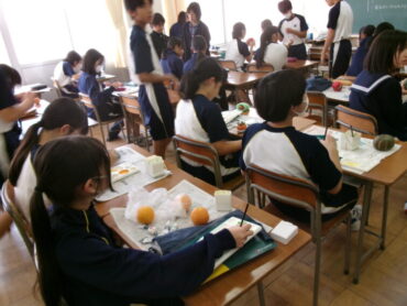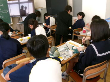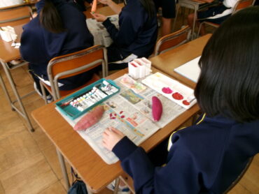 2025.10.28 NEW 7学年 7年 美術「静物」 美術室横を通ると、なにやらおいしそうな果物や野菜が見えました。7年生が粘土で作っている作品です。色塗りが進むと、どちらが本物か分からない完成度でした。どれもおいしそうです。