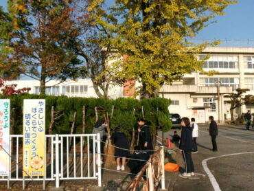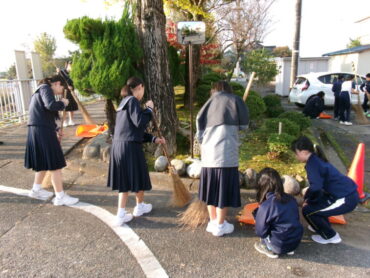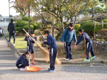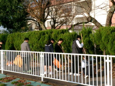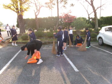 2025.11.7 NEW 4学年 8学年 落ち葉はきボランティア 後期課程環境委員会が企画した「落ち葉はきボランティア」が始まりました。今日は4年生と8年生が登校後、校門前や駐車場の周辺の落ち葉を掃いてくれました。今年は、紅葉も遅いためか、落ち葉はまだ多くないようです。でも学校や地域をきれいにしようとする気持ちがうれしいのです。