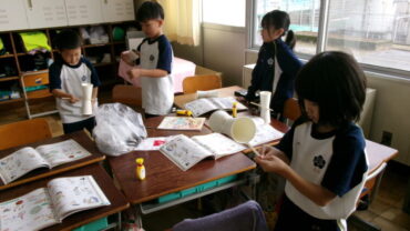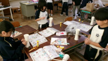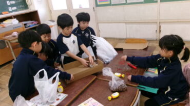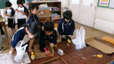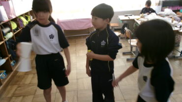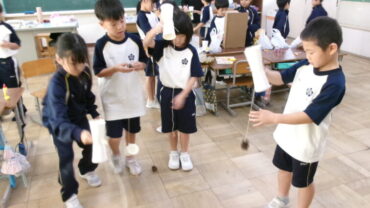 1年生は、生活科の学習で、葉っぱやどんぐり、まつぼっくりを使って、おもちゃ作りをしています。今日は、まつぼっくりのけん玉や、どんぐりを使った迷路を作りました。作ったおもちゃで、さっそく遊んでみました。けん玉のひもの長さを変えて、より楽しく遊べるように工夫したり、どんぐりの通る場所をどうすればスムーズに進むかを友達と相談したりしながら、楽しく活動しました。
