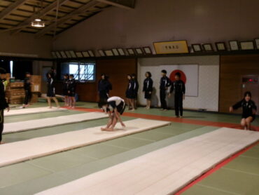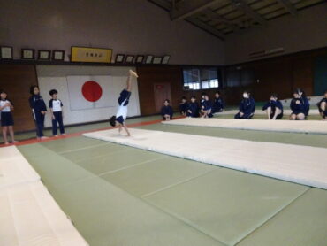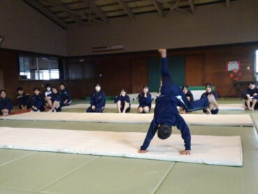 8年生は、体育でマット運動に取り組んでいます。技を組み合わせて発表するために練習しています。側方倒立回転が全員行う課題種目になっています。そこで、今日は休み時間に軽やかに側転やロンダートをしている3年生と担任の先生がゲストティーチャーとして来てくれました。8年生に向けて、手本を堂々と披露してくれました。3年生の思いきった足の振り上げや、ピンピンに伸びた大きな姿勢に8年生も拍手です。3年生の手本でよいイメージができた8年生は、その後も思い切って練習に取り組んでいました。普段は上級生から学ぶことが多いですが、このように下級生からも学ぶことができるのは、義務教育学校のよさですね。