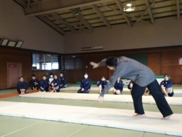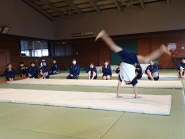 8年生は、体育でマット運動に取り組んでいます。技を組み合わせて発表するために練習しています。側方倒立回転が全員行う課題種目になっています。そこで、今日は休み時間に軽やかに側転やロンダートをしている3年生と担任の先生がゲストティーチャーとして来てくれました。8年生に向けて、手本を堂々と披露してくれました。3年生の思いきった足の振り上げや、ピンピンに伸びた大きな姿勢に8年生も拍手です。3年生の手本でよいイメージができた8年生は、その後も思い切って練習に取り組んでいました。普段は上級生から学ぶことが多いですが、このように下級生からも学ぶことができるのは、義務教育学校のよさですね。
