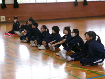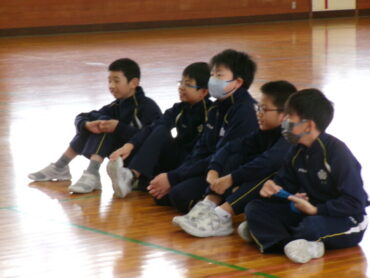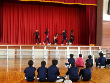 5年生は、「はげしい動きの表現運動発表会」を行いました。パンチやキックといった、「対決」のはげしい動きや、噴火や土砂崩れなどの「自然」に関するはげしい動きを表現しました。子供たちは、見ている人がどんな動きをしているのか、何を表しているかがよく分かるように、音に合わせて動いたり、体を大きく動かしたりして、工夫して表現していました。