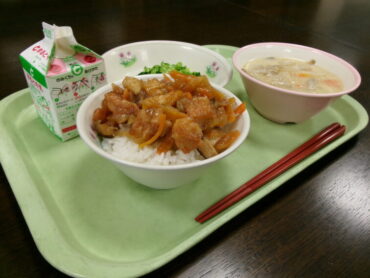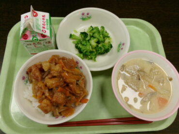19日は、毎月「食19丼」の日です。今日は「国吉きのこのチキン南蛮丼」でした。名前に「国吉」が入って、子供たちも一層おいしさが増したのではないかと思います。豆乳汁も心身ともに温まる優しいおいしさでした。今日もごちそうさまでした。