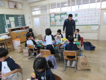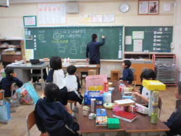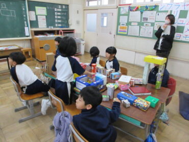 今日の図工は、家から集めてきた空き箱を使って、好きなものを作る授業でした。箱の大きさや形を生かして、いろいろな組み合わせを考えました。家やきりん、ロボット、工場、神社、船…など、どんどん想像が広がりました。