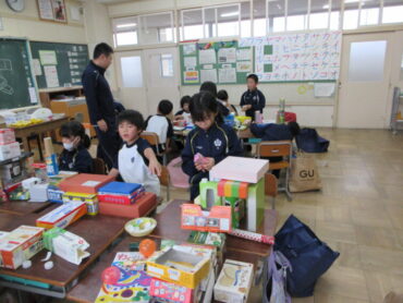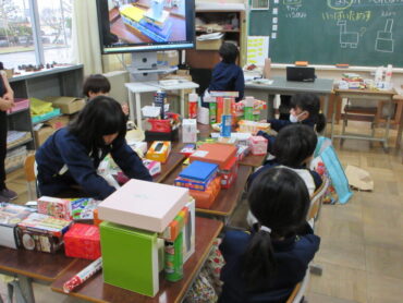 今日の図工は、家から集めてきた空き箱を使って、好きなものを作る授業でした。箱の大きさや形を生かして、いろいろな組み合わせを考えました。家やきりん、ロボット、工場、神社、船…など、どんどん想像が広がりました。