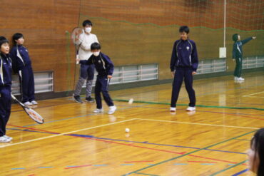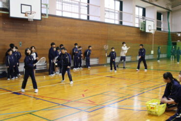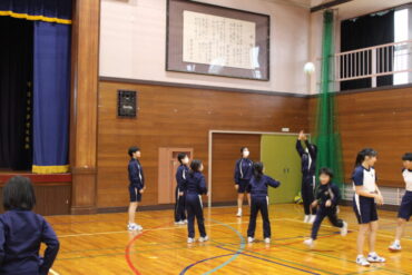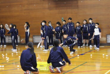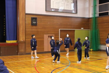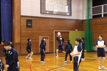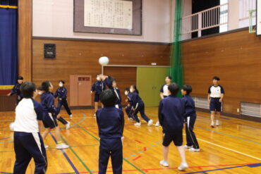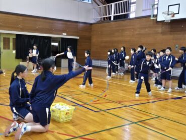 2025.12.3 4学年 5学年 7学年 7年 「架け橋プロジェクト」ソフトテニス部・バレーボール部体験 今日は、ソフトテニス部とバレーボール部の体験交流を行いました。ソフトテニスでは、一本打ちをしました。7年生の見本を見て、真似しながら楽しく打ちました。バレーボール部では、円陣パスを行いました。4・5・7年生で5~6人のグループを作って、声をかけ合いながら行いました。ボールを落とさないようにみんなで必死につなぐ姿は、学年を超えた団結力が生まれていました。今日で折り返しです。4・5年生は、興味のある部活動が増えてきたかな?