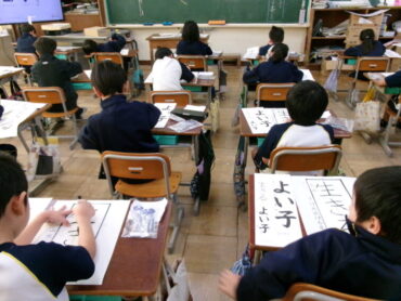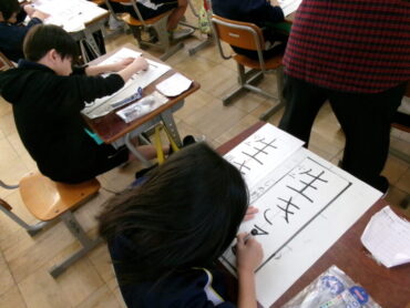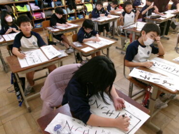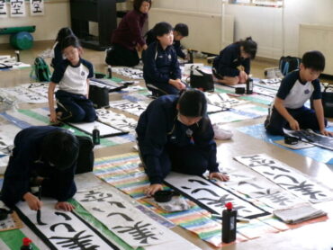 2025.12.9 2学年 4学年 5学年 書初め練習 前期課程では、各学年の書初め練習が進んでいます。今日は、2年生、4年生、5年生が教室や各階広場で行いました。回数を重ね、力強さも増してきているのではないでしょうか。 2年:「生きる」 4年「美しい空」 5年「平和な海」