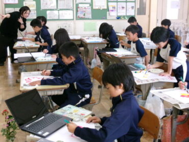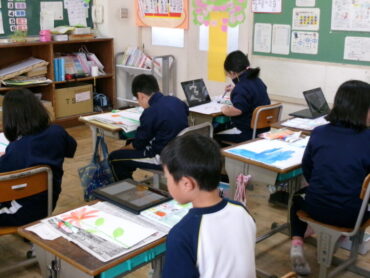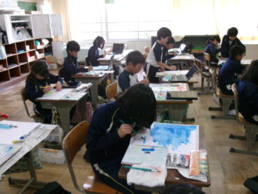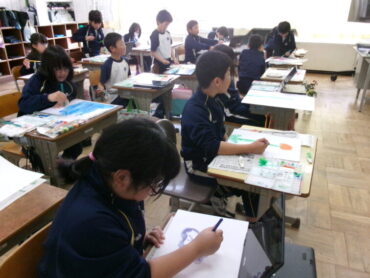 3年生は、学習端末を使って自分で撮ったお気に入りの花を描いていました。紙の大きさや形も選んで自由に描いています。鮮やかな色遣いの素敵な花がたくさん描かれていました。
