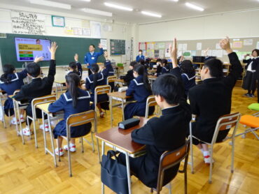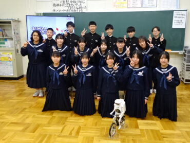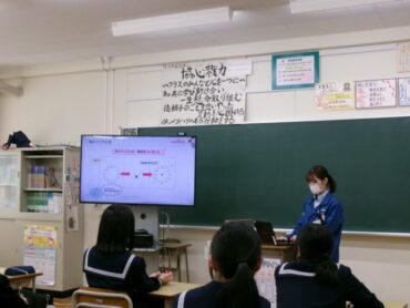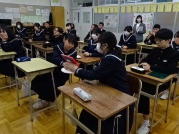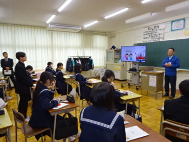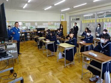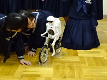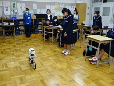 8年生が、富山村田製作所から講師の先生をお招きして、ものづくりに関わるお話を聴きました。村田製作所の事業内容や講師の先生自身のご経験や考えなどをお聞きし、自分自身の将来を考える貴重な機会となりました。自転車に乗るロボットの「ムラタセイサク君」も登場し、実際に操作もさせていただきました。
