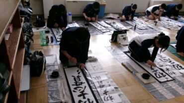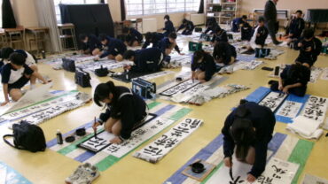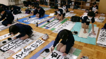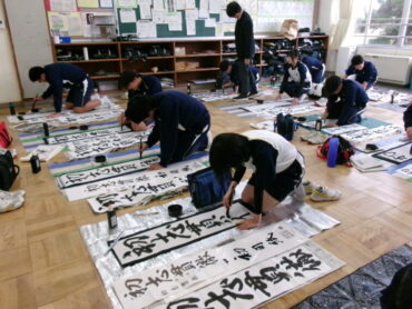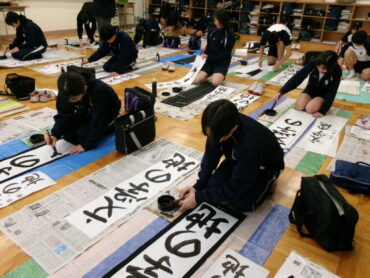 2025.12.15 7学年 8学年 9学年 後期課程 書初練習 今日の5限目は、7、8、9年生が一斉に書初練習を行いました。 今年度は、7年生は「伝統芸能」、8年生は、「文学の地」、9年生は、「初志貫徹」に挑戦します。どの学年も久しぶりの書初でしたが、真剣に取り組んでいました。