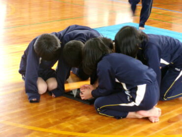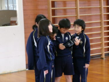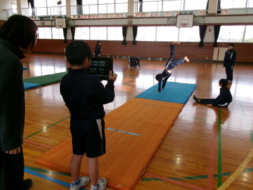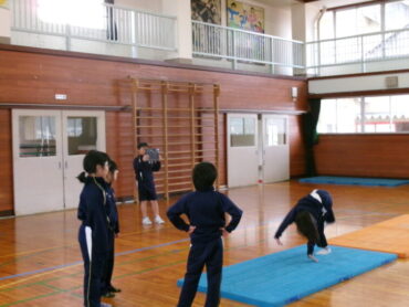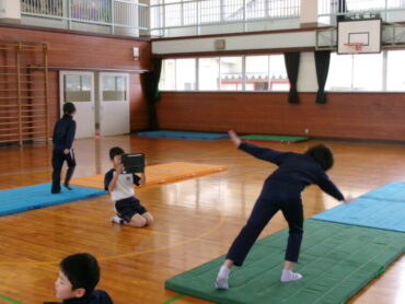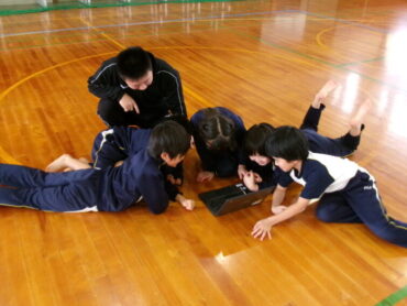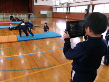 3年生の体育は、マット運動をしています。今日は、学習端末を使って撮影し合い、自分の技の出来栄えを確認しました。試技を終えた後、すぐに自分たちの姿を見合うことは、適切なアドバイスにもつながり、効果的に高め合うことができます。また、次の練習への学習意欲も高めてくれます。