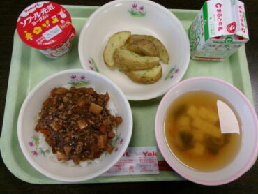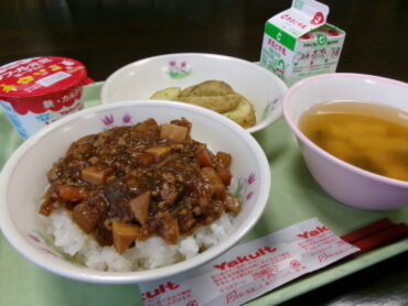 2学期最後の食19丼は、「高岡野菜の肉みそ丼」でした。赤みそに大根、タケノコ、シイタケ、豚肉…たくさんの食材が入った肉みそは、ごはんに乗せると、おいしさもアップし、たくさん食べることができました。