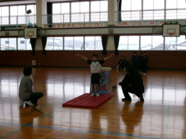 横の開脚跳びに挑戦していました。着地後のポーズまでしっかりと意識されていました。