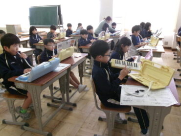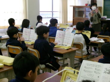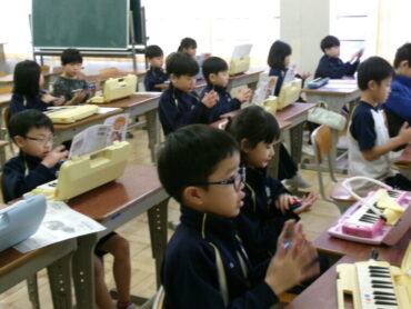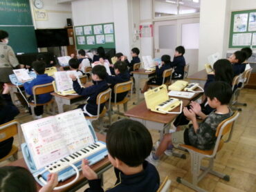 2年生が音楽の授業で『山のポルカ』を演奏していました。鍵盤ハーモニカや、手拍子、カスタネット、タンバリンと、いろいろな方法で拍に乗って楽しく演奏しました。みんなリズムよく、息もぴったり合っていました。