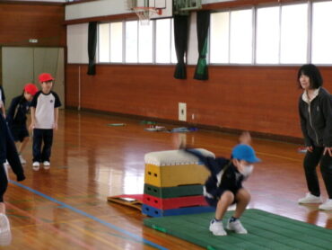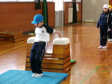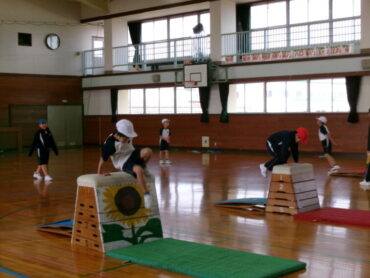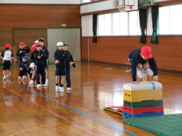 2026.1.19 2学年 2年 体育 「跳び箱遊び」 2年生も体育は、跳び箱を練習しています。手の付く場所や体の送り方など、こつがいくつもあります。真ん中が繰りぬかれている練習用の跳び箱も使って、技を習得しています。