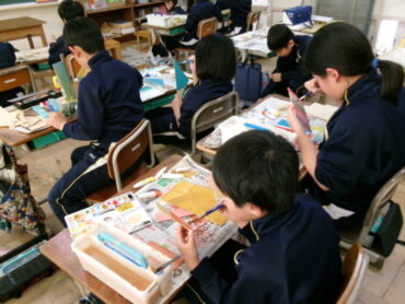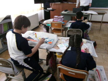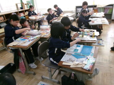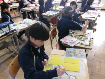 4年生は図画工作科で「カクカク板を組み合わせたら」の学習を行っています。正しいのこぎりの使い方を確認し、板を切り分けました。