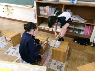 切った材料をヤスリがけしたあと、組み合わせてどんな形にするのかイメージをふくらませました。「こんな形にしたら面白いかも」「棚になりそう!」と思い思いの形を考えていました。色をぬって、完成するのが待ち遠しいですね。