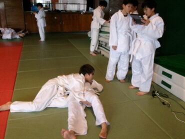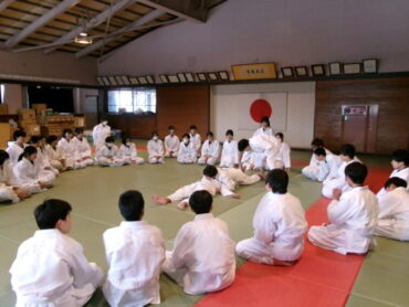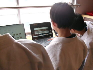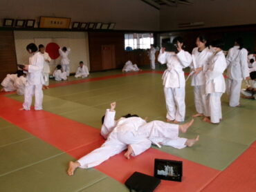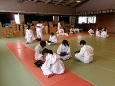 7年生の柔道では、「横四方固め」に取り組んでいます。相手を横から抑える固め技です。動画を取り合い、自分たちの動きを確認したり、互いにアドバイスしあったりしています。組み合って勝負する練習は、みんな気持ちが入ります。しっかり約束を守りながら、安全に取り組んでいます。