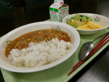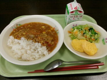 今日はSDGs目標2「飢餓をゼロに」にちなんだ「未来の食事献立」でした。メインは大豆ミート入りキーマカレーです。大豆ミートとは、大豆で作られたお肉のような見た目や食感の食べ物で、お肉の代わりになる食材として注目を集めています。