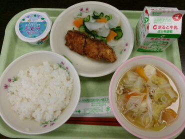 今日の給食は、私たちが住む富山県、高岡市の海や陸でとれた食材を使用しています。今日の給食を通して身近な海や陸の食材を知り、味わうことで、海や陸を守っていくことの大切さについて、考えてくれたら嬉しいです。