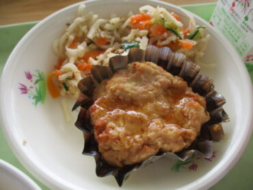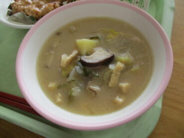 主菜の「おから入り和風ミートローフ」では、大豆から豆腐や豆乳を作る過程でできる「おから」を、豚ひき肉や野菜と一緒にまぜて作りました。また、生椎茸の軸の部分を廃棄することなく細かく刻んで使用しています。副菜の「切り干し大根のごま酢和え」では、人参をよく洗って皮付きのまま使用しました。汁物の「酒かす汁」は、日本酒を製造する過程でできる「酒かす」を使用し、生椎茸の傘の部分を薄く切って入れました。