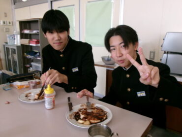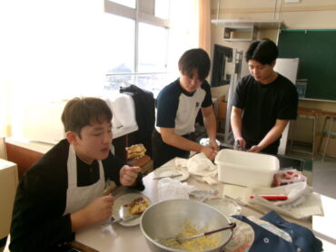 9年生が家庭科の時間に調理実習をしました。義務教育学校最後のおやつ作りに真剣に取り組んでいました。抹茶の蒸しパンやホットケーキに見た目も楽しいトッピングをして、笑顔でいただきます!