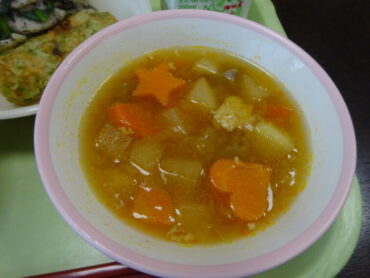 2月13日は「日本遺産の日」で、高岡鋳物発祥の地、金屋町にちなんだ献立でした。主菜の「竹輪の高岡銅器風揚げ」は、青銅を青のりで表しました。副菜の「鋳物師のごまみそあえ」は、れんこんと黒すりごまで金属を流し込む鋳物の型と砂型の砂をイメージしてあります。汁物は「金屋町の石畳煮」です、大根と黒こんにゃくをさいころ状に切ることで金屋町の石畳を表しました。石畳にはところどころに銅片のハートや星形がちりばめられていることから、ハートや星形に型抜きした人参を入れました。