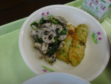 2月13日は「日本遺産の日」で、高岡鋳物発祥の地、金屋町にちなんだ献立でした。主菜の「竹輪の高岡銅器風揚げ」は、青銅を青のりで表しました。副菜の「鋳物師のごまみそあえ」は、れんこんと黒すりごまで金属を流し込む鋳物の型と砂型の砂をイメージしてあります。汁物は「金屋町の石畳煮」です、大根と黒こんにゃくをさいころ状に切ることで金屋町の石畳を表しました。石畳にはところどころに銅片のハートや星形がちりばめられていることから、ハートや星形に型抜きした人参を入れました。