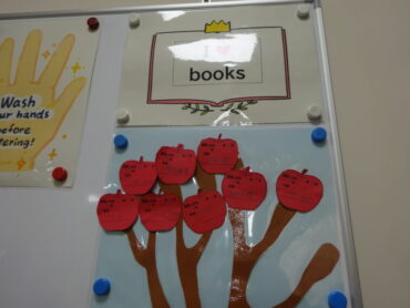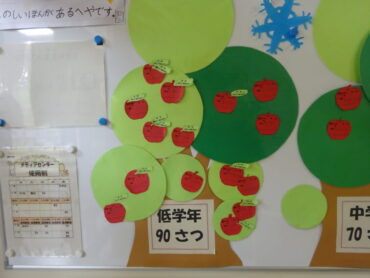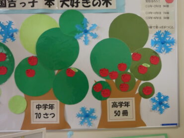 図書委員会では、「国吉っ子 本 大好きの木」の取組をしています。目標冊数を借りると、リンゴの実がもらえます。赤い実がどんどん増えてきています。たくさん実るとよいですね。前期課程の取組にとどまらず、後期課程への広がりを見せています。
