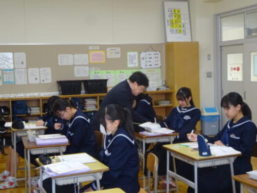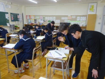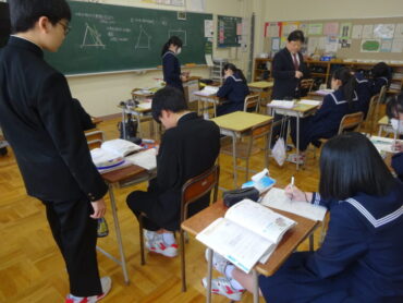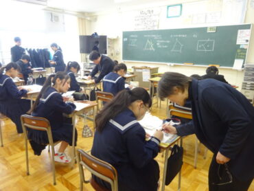 8年生の数学は、「等積変形」を学習しています。図形の面積を変えずに、別の形に変えるのです。課題1では、四角形を三角形に変えることに挑戦していました。底辺を固定したり、平行線の性質を使ったりと考えていくと、チャレンジが楽しくなってきます。