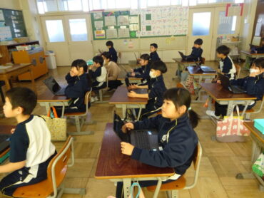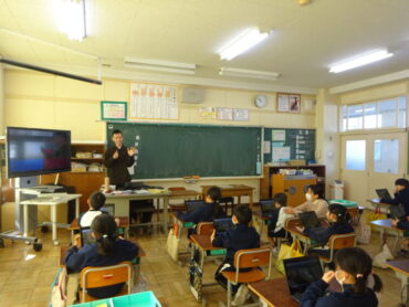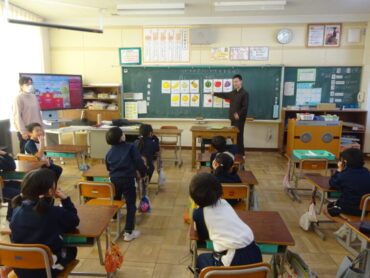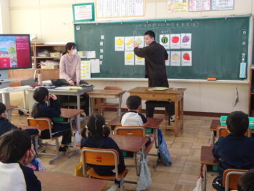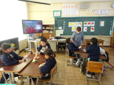 2026.2.23 NEW 1学年 1年 外国語活動 1年生の外国語活動は、もりだくさんです。まずは端末を使ってクイズで復習。長さや数などをどんどん答えていました。次は、果物を仲間で分け、絵を見て英語で答えました。全員でも一人でもみんな上手に言えました。そして、最後には、カードをめくって絵を答えるゲームを3人グループで行いました。テンポよくいろいろな単語が飛び交っていました。