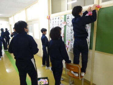 2026.2.26 NEW 5学年 5年 新しいリーダーとして 5年生が、意欲的に活動しています、先日は6年生の修了をお祝いする集会のリハーサルを行いました。写真は片付けの様子です。練習が終わって片付けに入ると、みんな真っ先に仕事を始めました。 今日は、廊下の掲示を行いました。協力する姿、黙々と作業する姿、率先して動く姿。前期課程をリードしていく意欲にあふれています!