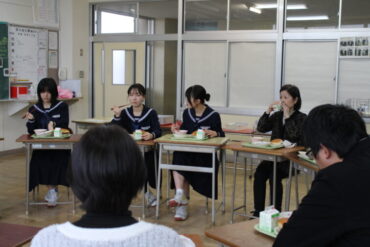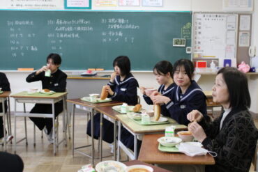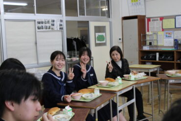 2026.2.26 NEW 9学年 9年 「思い出ランチ②~1年時の担任の先生と~」 9年生の思い出ランチ第2弾は、なんと1年時で担任だった先生との給食でした。(これも義務教育学校ならではです!)9年前、まだ小さかったみんなですが、今では全員が担任だった先生の身長を越え、たくましくなっていることが分かりました。1年時の担任の先生からは、「1年生のときから、みんな給食を残さず食べていたよ」というエピソードも語られました。入学の「おめでとう」も、卒業の「おめでとう」も言ってもらえて、言うことができて、幸せな生徒と先生の時間でした。