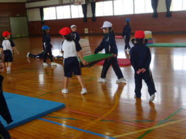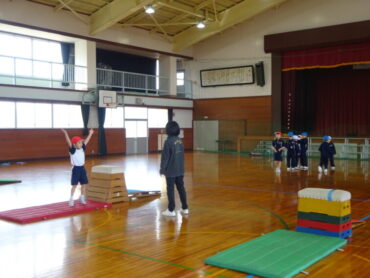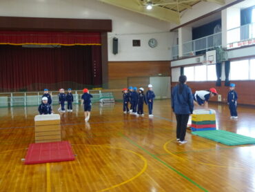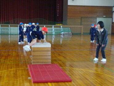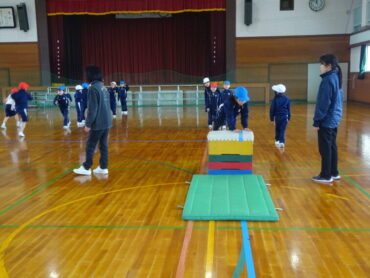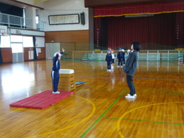 2026.2.27 NEW 1学年 1年 体育「とびばこあそび」 1年生の体育は跳び箱にチャレンジしていました。体育館をのぞいた時には、ちょうど準備をしていました。協力して安全に用具を運んでいます。これも体育の大事な部分です。その後、4段や5段の高い段に何度も挑戦していました。着地後のポーズもしっかりできています。