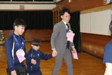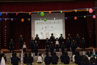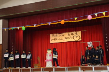 2年生は手作りの招待状を手渡しました。1年生は6年生の手を引いて入場しました。3年生は6年生に関わるクイズで盛り上げました。4年生は手作りのマスコットマグネットをプレゼントしました。そして5年生は、企画・運営、会場づくり、そして、6年間を楽しく振り返る「思い出劇」で会場を沸かせました。6年生からもお返しとして、歌のプレゼントがありました。