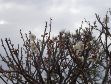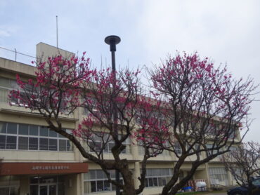 2026.3.6 全校生 梅の花 正面の紅梅が満開を迎えています。香りも感じられ、春本番となってきました。白梅は少し遅れて開花を始めました。卒業式・前期課程修了式を来週に控え、樹木や草花も準備を整えています。